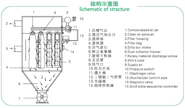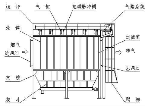 含塵空氣進(jìn)氣口進(jìn)入除塵箱,因氣體突然擴(kuò)張,流速驟然降低,顆粒較粗的粉塵,靠其自重力向下沉降,落入灰斗。細(xì)小粉塵通過各種效應(yīng)被吸附在濾袋外壁,經(jīng)濾袋過濾后的凈化空氣,通過文氏管進(jìn)入上箱體,從出氣口排出,被吸附在濾袋外壁的粉塵,隨著時(shí)間的増長(zhǎng),越積越厚,除塵器阻力逐漸上升,處理的氣體量不斷減少,為了使集塵器經(jīng)常保持有效狀態(tài),設(shè)備阻力在一定的范圍內(nèi),就需要清除吸附在濾袋外面的積灰。