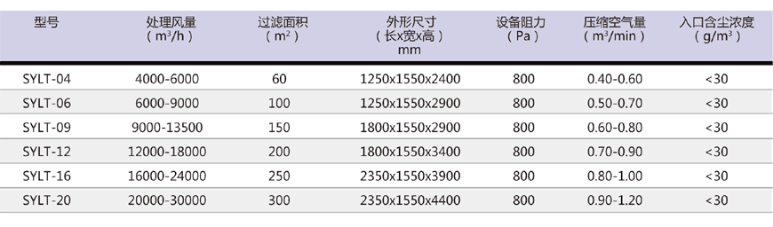 SYLT脈沖式濾筒除塵器主要參數(shù):