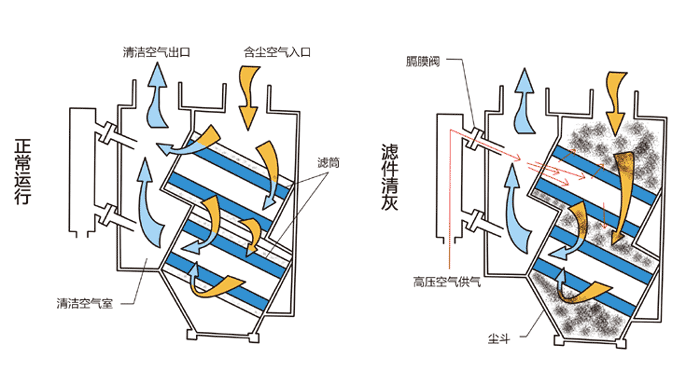脈沖式濾筒除塵器設(shè)有進(jìn)風(fēng)口、濾筒、出風(fēng)口、氣包、脈沖控制儀、噴吹閥、噴吹管等,濾筒是由聚脂纖維折疊、卷制而成,其下端封閉,上端中心正對噴吹管下口。含塵氣體由進(jìn)風(fēng)口進(jìn)入除塵器后,氣流速度減慢,粗顆粒脫離氣流沉降到集塵室內(nèi),細(xì)微粉塵隨氣流穿過濾筒時(shí)被阻于濾筒外表面,潔凈氣體由出風(fēng)口排出;當(dāng)濾筒表面灰層較厚時(shí),脈沖控制儀發(fā)出指令開啟噴吹閥,氣包內(nèi)的壓縮空氣經(jīng)噴吹管高速噴出,同時(shí)誘導(dǎo)數(shù)倍于噴射氣量的周圍空氣進(jìn)入濾筒,并由內(nèi)向外快速射出,將濾筒外表面的粉塵吹下落入集塵室內(nèi),最后由放灰斗排出。除塵器清灰采用脈沖噴吹方式,既做到了徹底清灰,又不傷害濾筒,使濾筒使用壽命得以保障。清灰過程由脈沖控制儀自動(dòng)控制,可采用壓力差控制或時(shí)間控制。